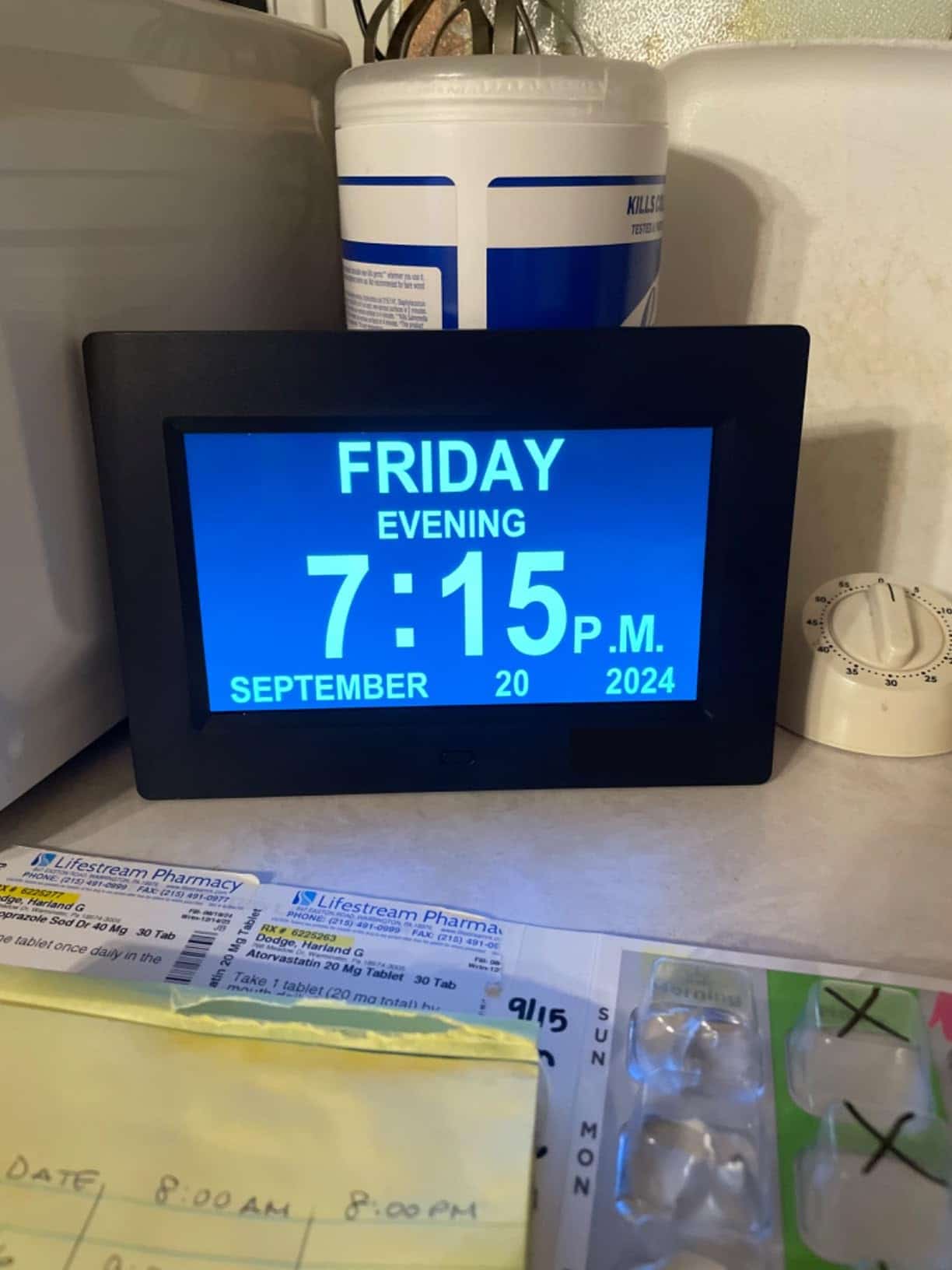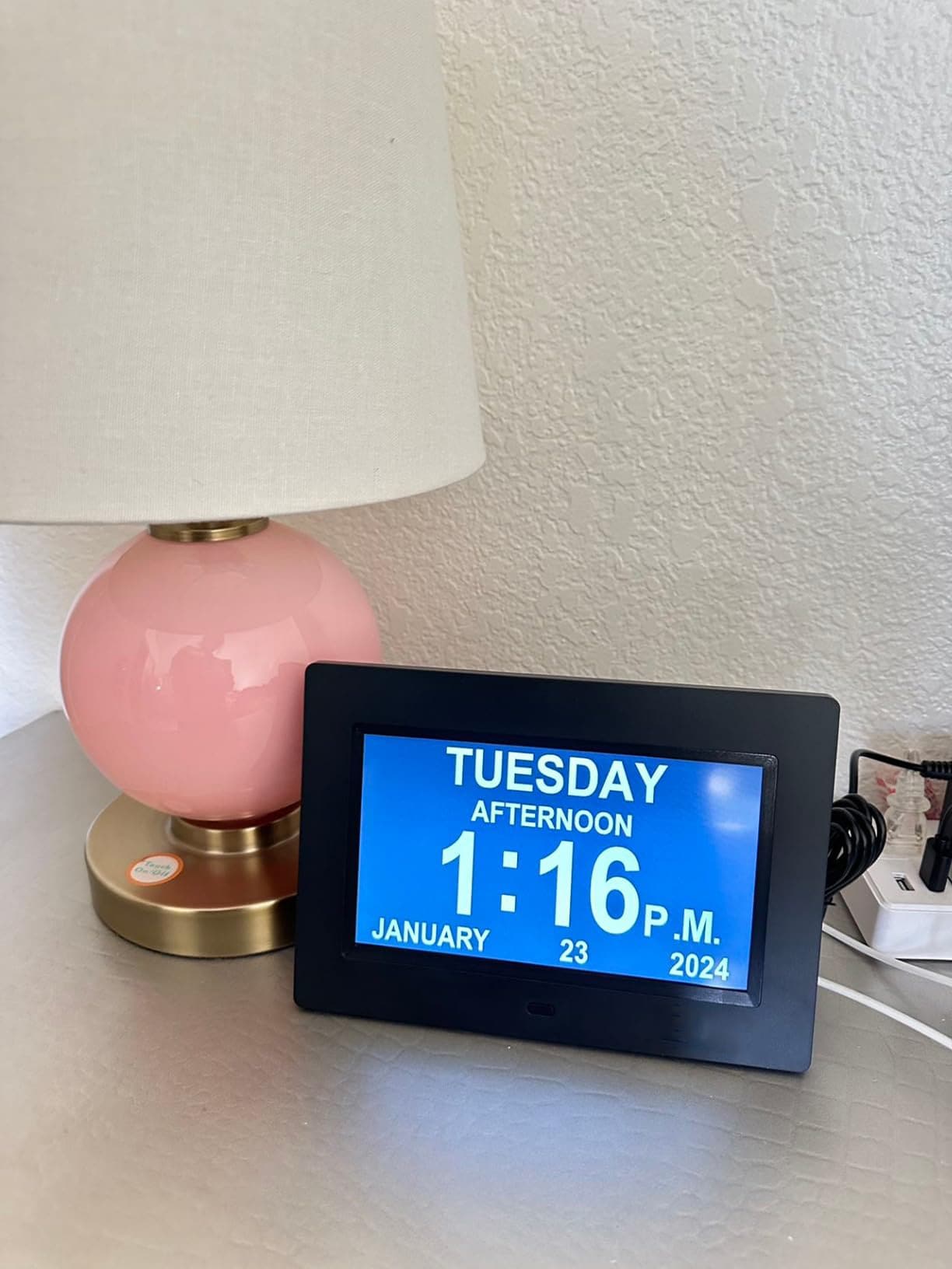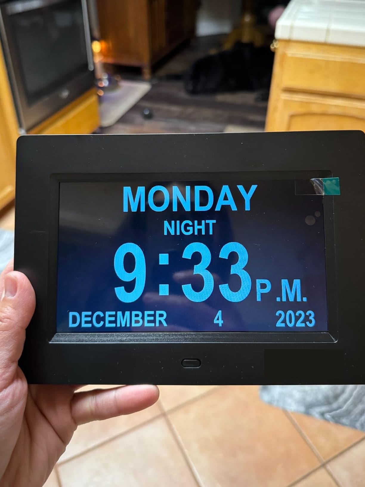 Oui, spécifiquement conçu pour cela. Le Calenvex affiche clairement jour, date et heure en permanence, aidant à maintenir l'orientation temporelle et réduisant significativement l'anxiété liée à la désorientation.