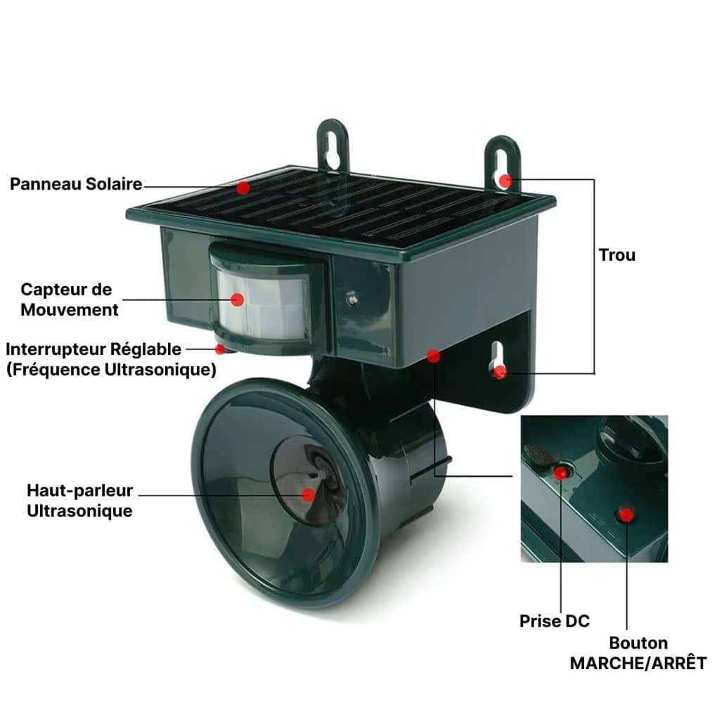 Le répulsif est principalement conçu pour les chauves-souris, mais il peut aussi être efficace contre certains oiseaux et rongeurs selon les réglages.