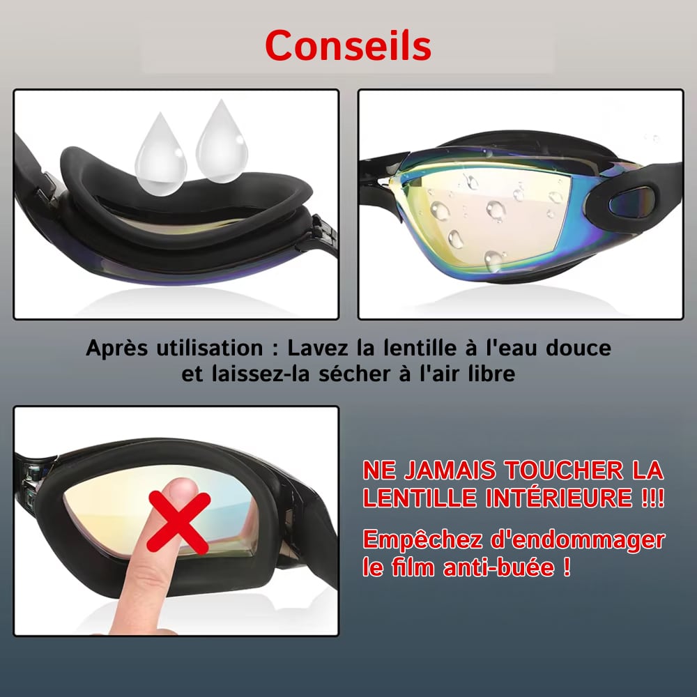 Pour entretenir vos HydrinVis, rincez-les à l'eau douce après chaque utilisation et séchez-les avec un chiffon doux. Évitez de toucher l'intérieur des verres pour préserver le traitement anti-buée.