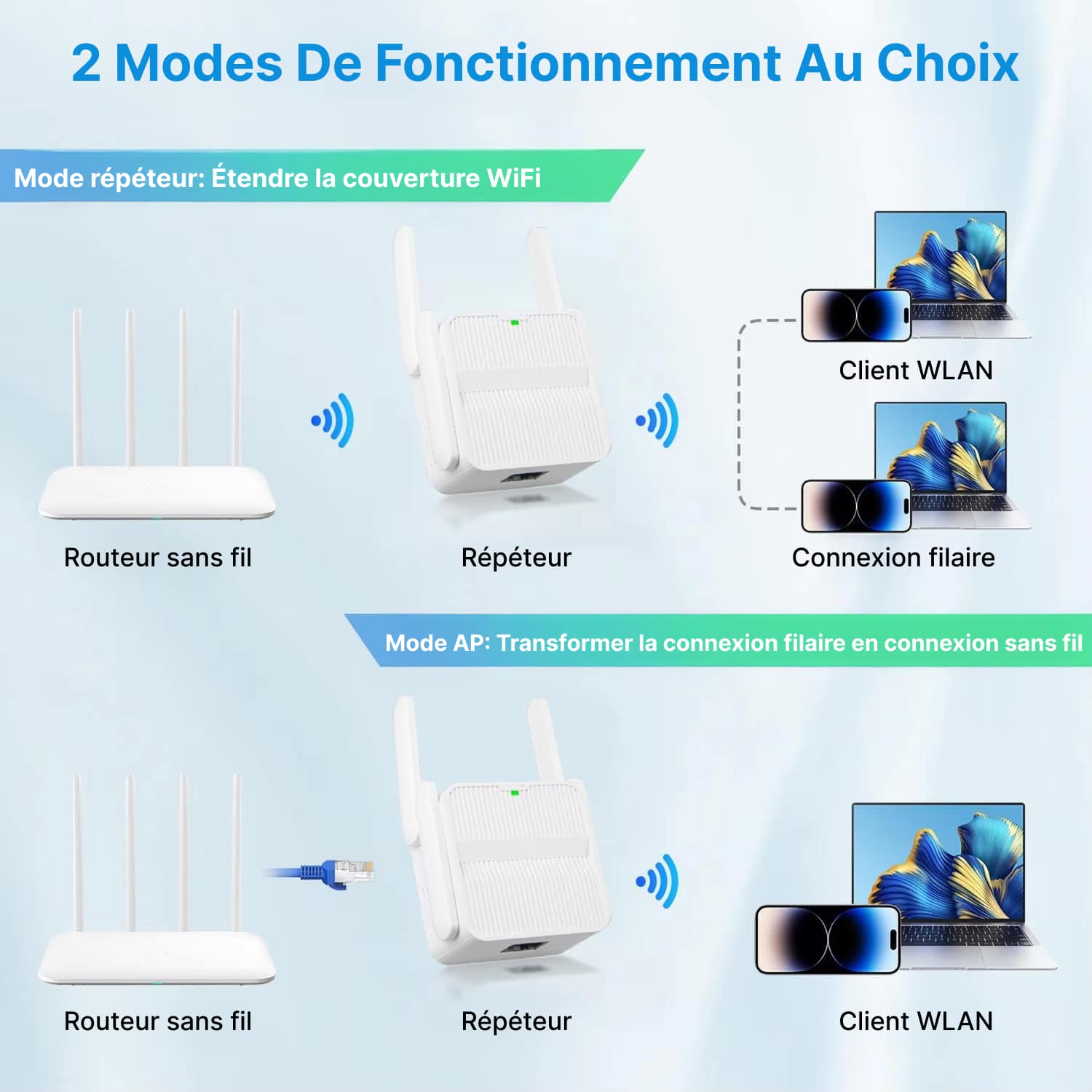 La bande 2.4GHz offre une meilleure portée à travers les murs, tandis que la bande 5GHz fournit des vitesses plus élevées. Le MaxiSigfi utilise intelligemment les deux pour des performances optimales.