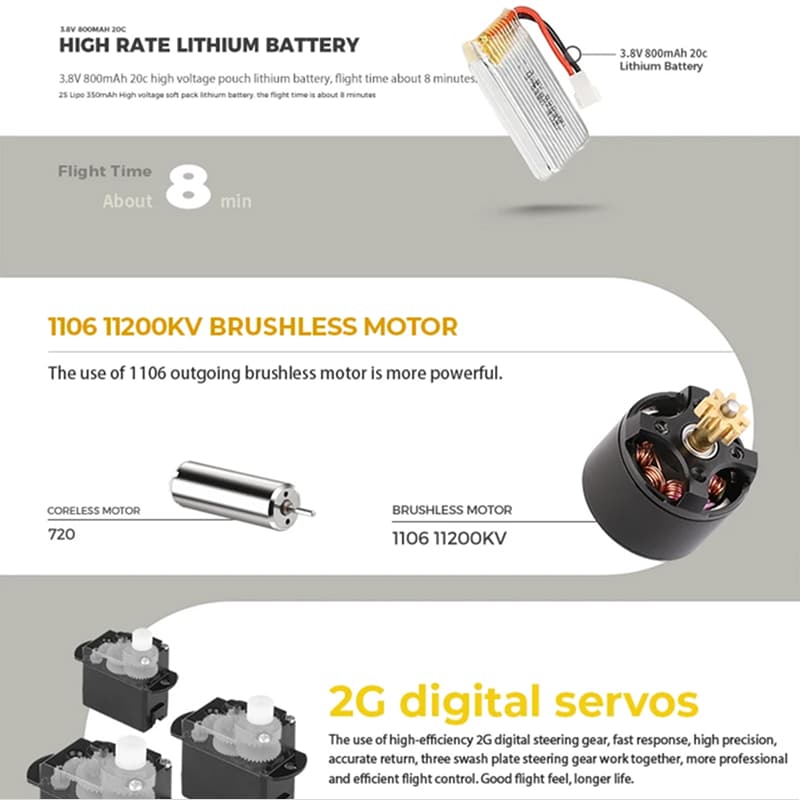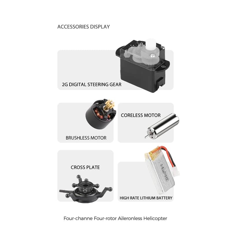 Les pales, servos et batteries sont des pièces standard disponibles chez la plupart des revendeurs spécialisés. La construction modulaire facilite les réparations rapides sans outils spécialisés.