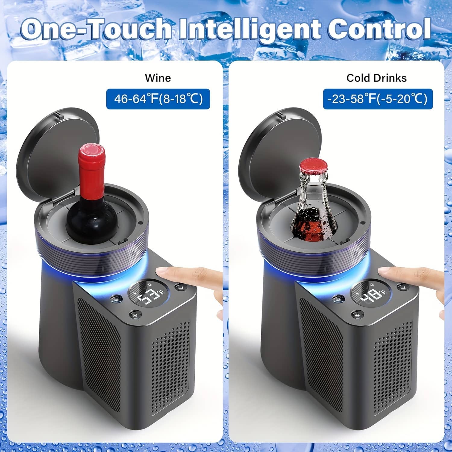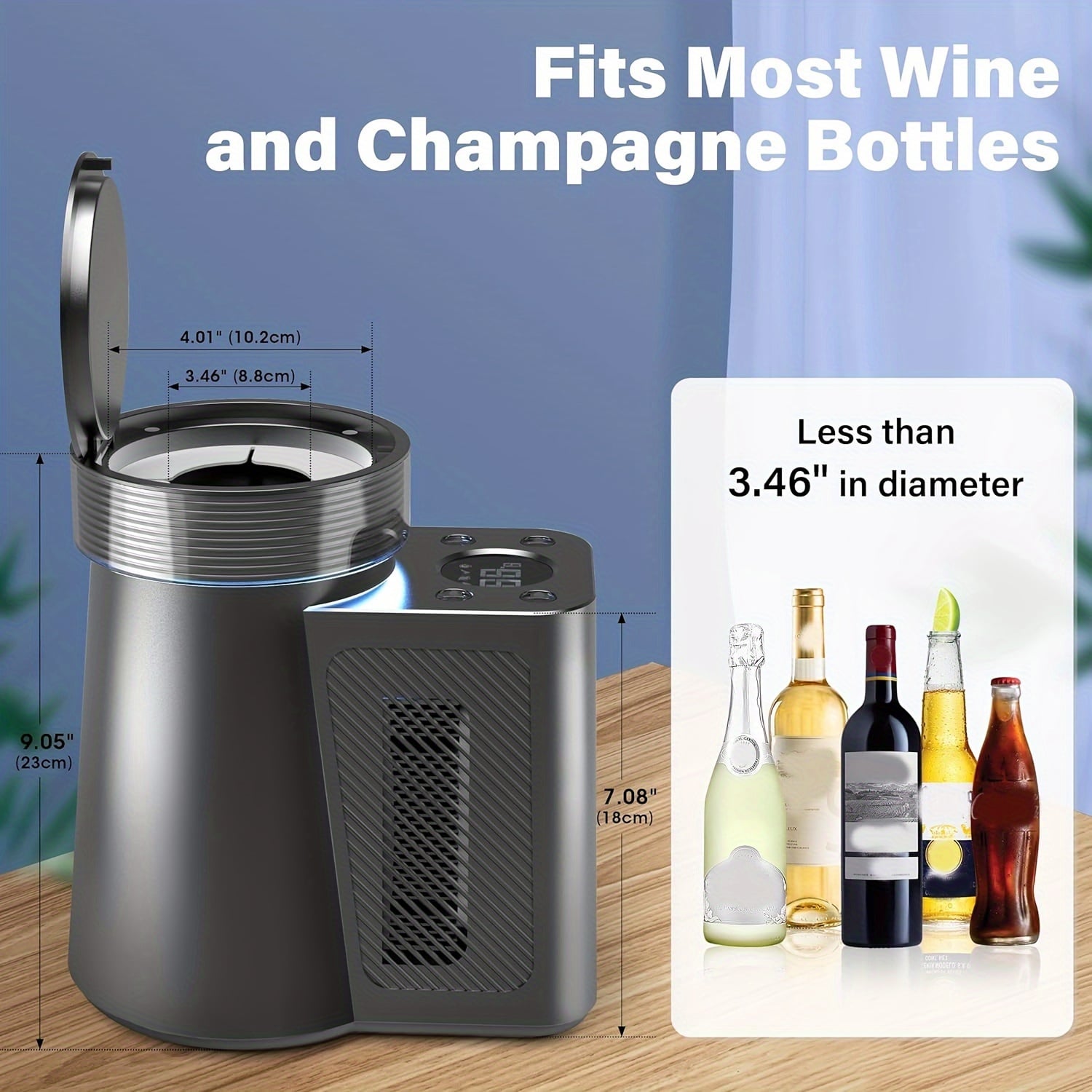 Accueillant des bouteilles jusqu’à 8,8 cm de diamètre, WineKoldy convient aux vins, champagnes et effervescents. Cette polyvalence parfaite assure que vos crus favoris atteignent toujours leur température idéale.